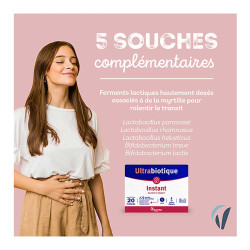 La formule Ultrabiotique Instant contient de la myrtille qui contribue à ralentir le transit et permet un rééquilibre...