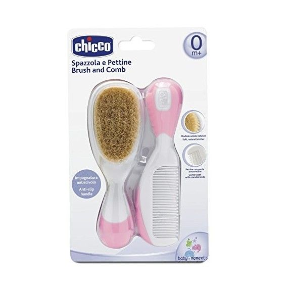Set Chicco composé d'une brosse et d'un peigne spécialement conçus pour bébé dès la naissance.