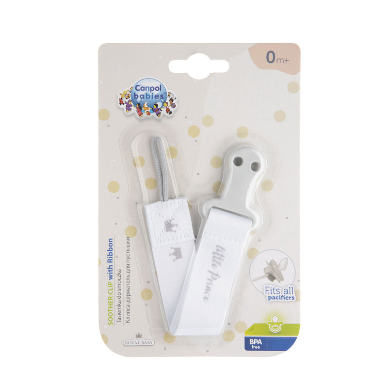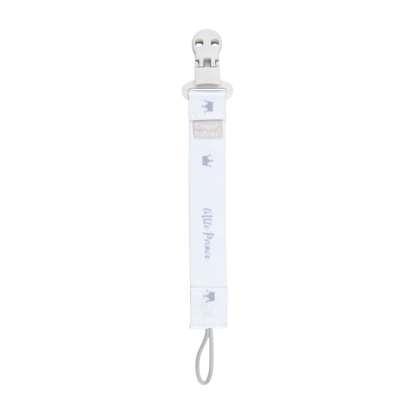 L'attache-sucette avec ruban de la collection "Royal Baby" est un gadget pratique qui empêchera la sucette préférée de votre bébé de tomber, de se salir ou de se perdre. La ficelle universelle à l'extrémité du ruban vous permet de l'attacher à n'importe quelle sucette avec une poignée, et le clip sécurisé à l'autre extrémité vous permet d'attacher le ruban aux vêtements de votre bébé. Convient aussi bien à la maison qu'en promenade. Le ruban est disponible dans les couleurs garçon et fille, vous pouvez donc facilement créer un ensemble stylé avec le reste de la collection "Royal Baby" : sucette et biberon.