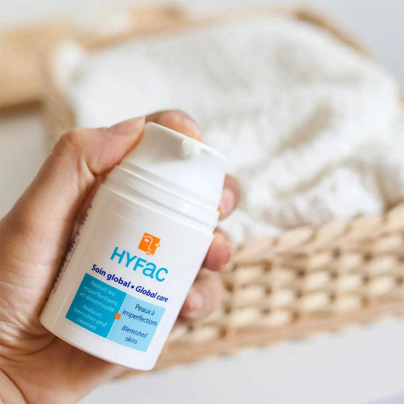 Le soin global Hyfac peut être utilisé en monothérapie, ou en complément des traitements contre l'acné. A l'arrêt du traitement contre l'acné, il est conseillé de continuer à utiliser le soin global Hyfac comme solution d'entretien afin de prolonger l'efficacité du traitement. Utilisé seul, il est recommandé pour le soin des peaux à tendance acnéique comme crème de jour et/ou de nuit. Son efficacité a été dé- montrée il contribue à éliminer les boutons rouges et blancs, les comédons (points noirs) et les microkystes.