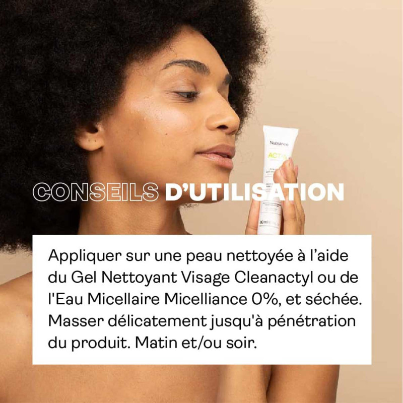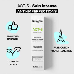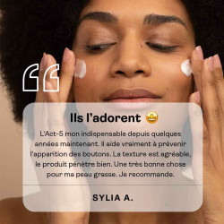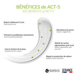 ACT-5 de Nubiance est le fruit d'une combinaison exclusive de trois actifs visant les cinq causes et conséquences factorielles de l'acné des peaux noires, mates et métissées.