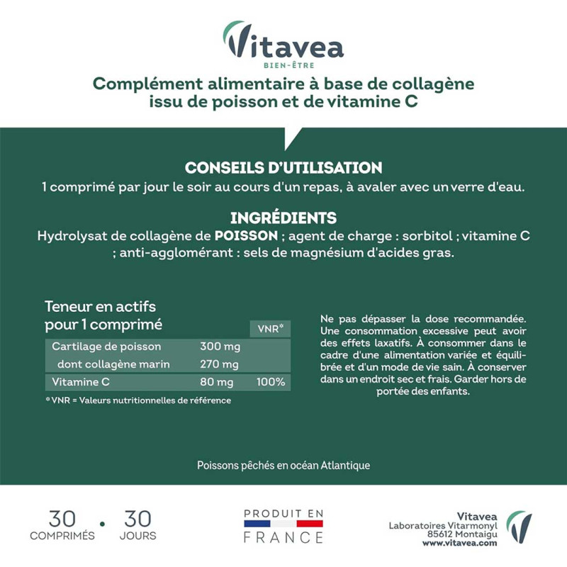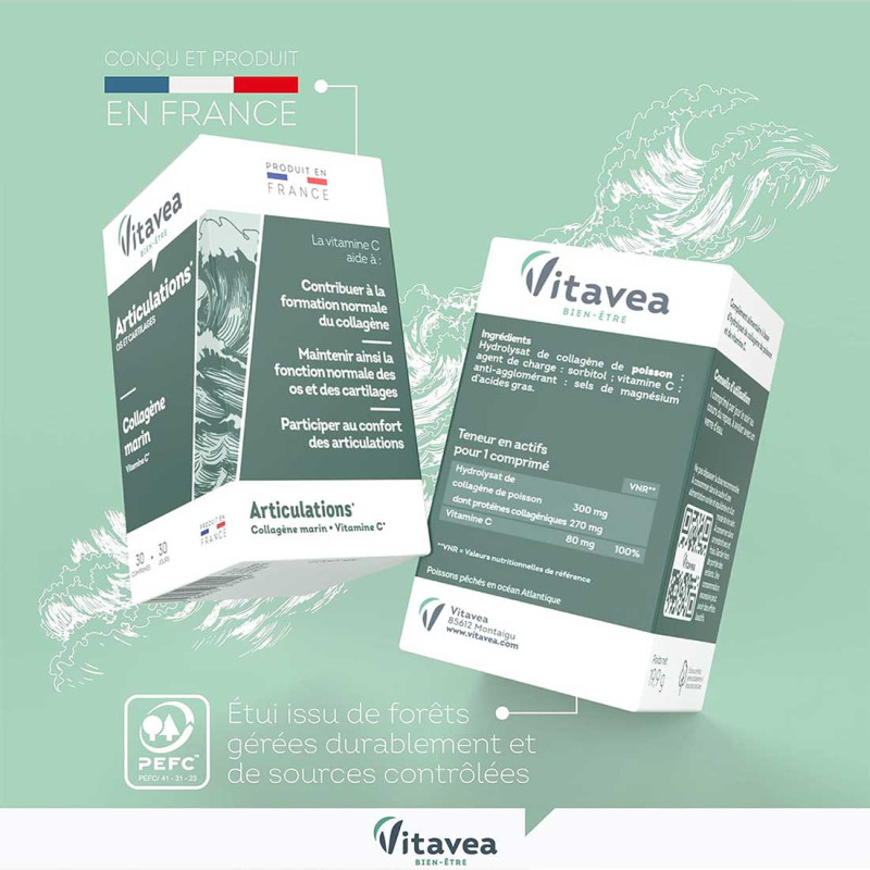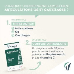 VITAVEA Articulations Os et Cartilages est un complément alimentaire à base de collagène issu de poisson et de vitamine C.