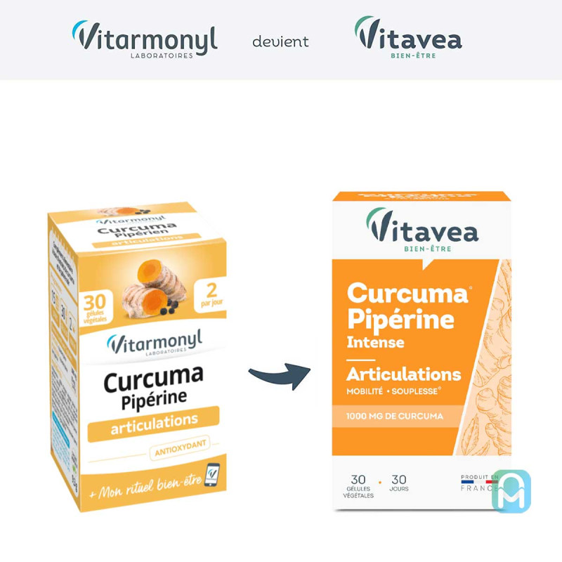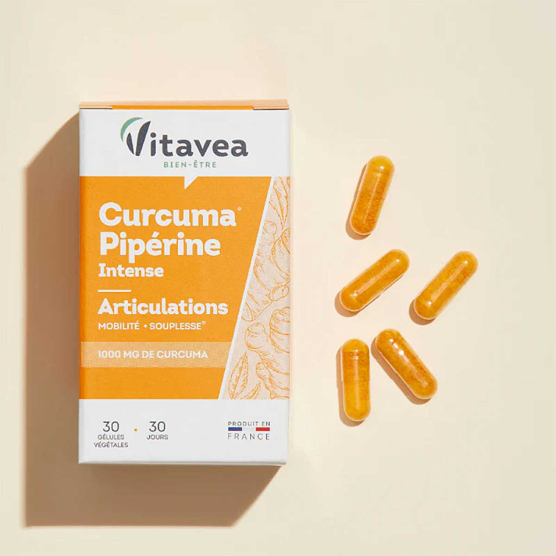 Curcuma Pipérine Intense Vitavea Bien-être est un complément alimentaire, sa formule contient des actifs reconnus et plébiscités pour limiter la sensibilité des articulations, soutenir la santé des articulations et des os et maintenir ainsi la mobilité : curcuma et pipérine.