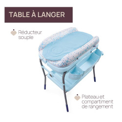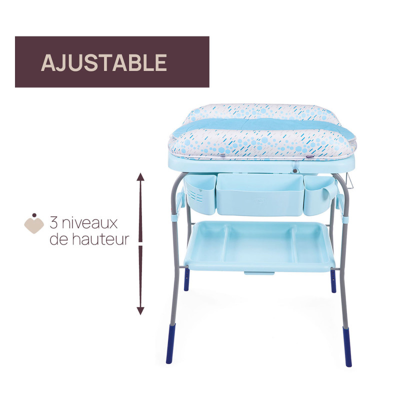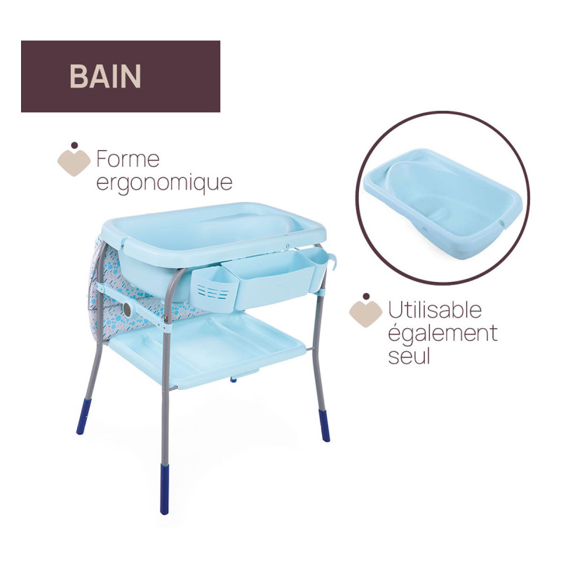 Ultra-pratique grâce au plateau et aux compartiments pour ranger tout le nécessaire pour le bain et le change.