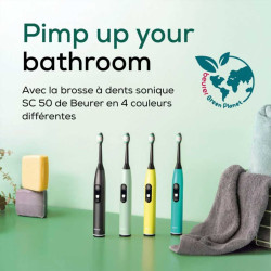 Des soins dentaires doux mais en profondeur : Avec 80 000 oscillations/min et capteur de pression intégré, la brosse à dents électrique SC 50 Ocean Breeze nettoie vos dents en douceur et élimine efficacement la plaque dentaire et les impuretés. 5 programmes s'adaptent à vos besoins, tandis que l'affichage de la durée de nettoyage et le minuteur à quadrants acoustiques vous aident à garantir une hygiène buccale optimale. Durable grâce à un boîtier en matériau 100 % recyclé, pratique avec plateau de charge magnétique et batterie puissante – dans le kit de démarrage avec 2 têtes de brosse à dents de dureté différente.