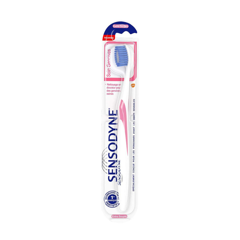 La brosse à dents Sensodyne Soin Gencives existe en deux souplesses : extra-souple et souple.