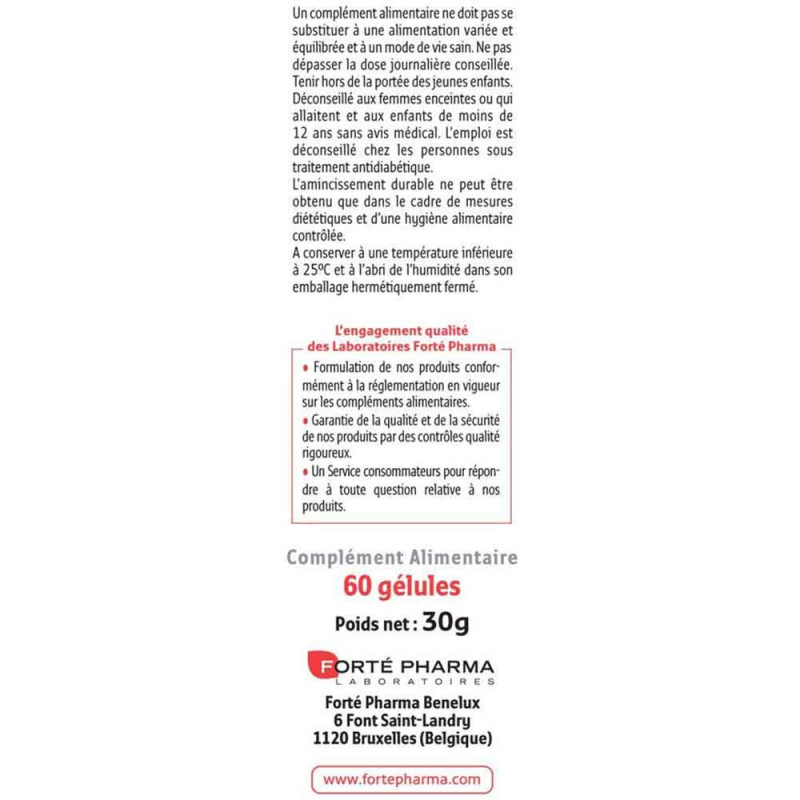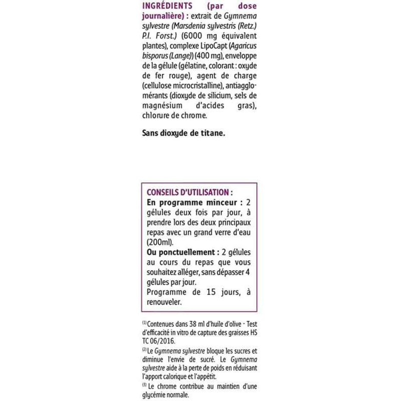 Extrait de Gymnema sylvestre (Marsdenia sylvestris (Retz.) P.I. Forts.) (6000mg équivalent plantes), complexe LipoCapt (Agaricus bisporus (Lange)) (400mg), enveloppe de la gélule (gélatine, colorant : oxyde de fer rouge), agent de charge (cellulose microcristalline), antiagglomérants (dioxyde de silicium, sels de magnésium d'acides gras), chlorure de chrome.