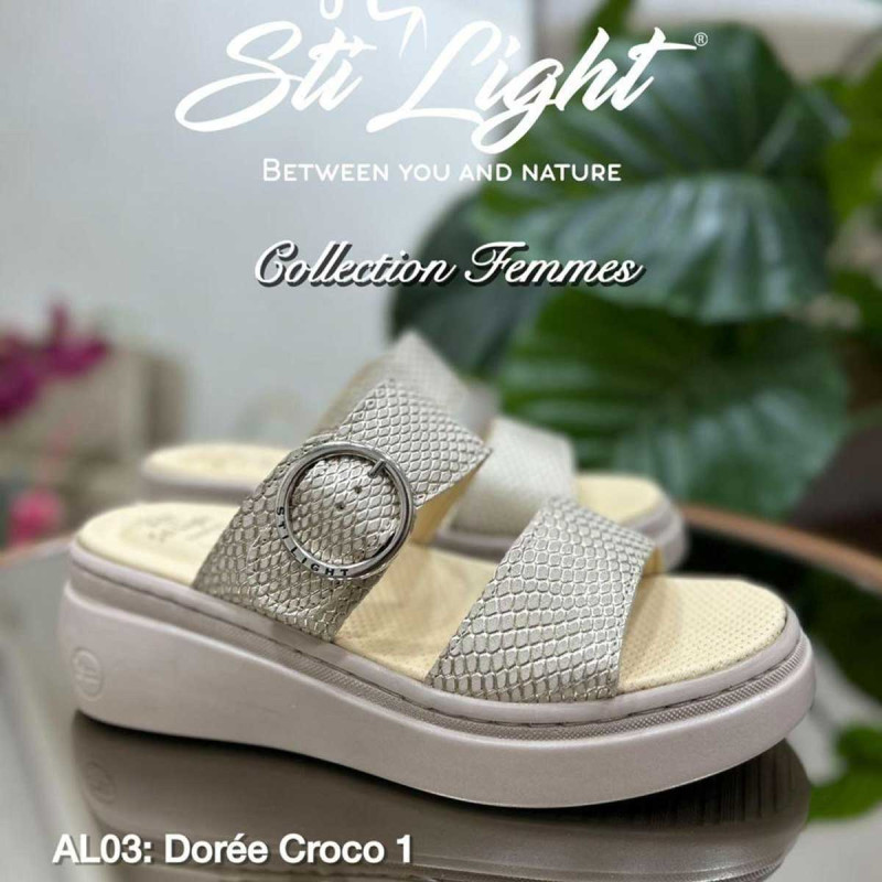 La claquette pour femme AL03 doré crocallie design moderne et bien-être grâce à sa conception orthopédique. Avec sa semelle ultra-souple et sa forme anatomique, elle soutient vos pieds tout au long de la journée, tout en réduisant la fatigue articulaire.