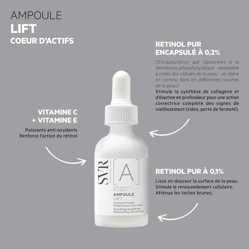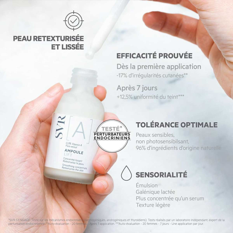 Découvre SVR ampoule [A] lift, le sérum au rétinol pur et Novoretin™ pour lisser les rides, resserrer les pores et unifier le teint. résultats visibles en 7 jours. convient à tous types de peau.
