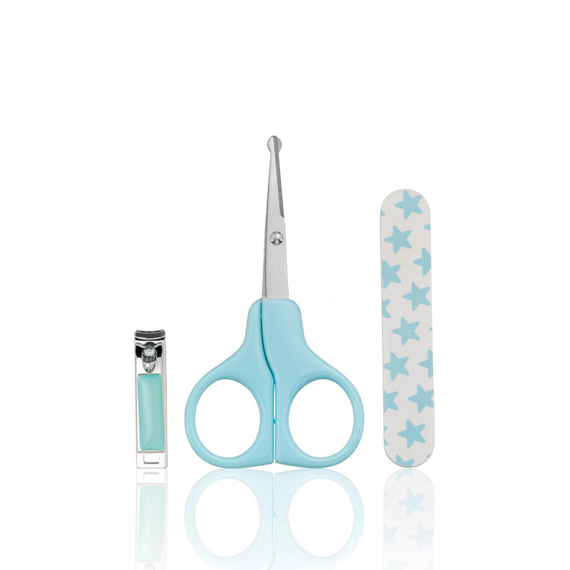 Contenu du coffret manucure bébé : 1 ciseau de sécurité à bout arrondi, 1 petit coupe-ongles et 1 lime à ongles délicate en sable.
