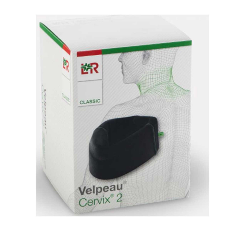 Velpeau Cervix 2 Classic est un collier cervical prêt à l'emploi de forme anatomique avec renfort et chanfrein sous le menton pour soutien moyen. Il stabilise la colonne cervicale et aide à réduire la tension musculaire au niveau du cou en conservant la chaleur.