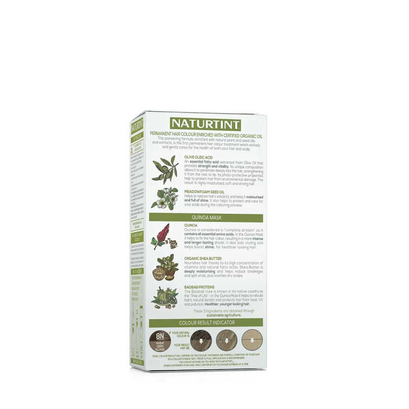 Naturtint® Colorant 60 ml: Peg-2 Oleamine. Aqua (Purified Water). Alcohol Denat. Peg-4 Rapeseedamide. Propanediol. Ethanolamine. Oleic Acid. Hydrolyzed Oat Protein. Hydrolyzed Corn Protein. Hydrolyzed Soy Protein. Hydrolyzed Wheat Protein. Limnanthes Alba Seed Oil. Tetrasodium Glutamate Diacetate. Sodium Metabisulfite. Sodium Erythorbate. P-Phenylenediamine. 2-Methylresorcinol. 4-Chlororesorcinol. M-Aminophenol. 2-Amino-4-Hydroxyethylaminoanisole Sulfate. Octadecyl Di-T-Butyl-4-Hydroxyhydrocinnamate.