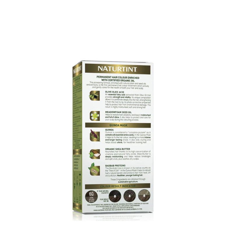 Naturtint® 6G Colorant 60 ml: Peg-2 Oleamine. Aqua (Purified Water). Alcohol Denat. Peg-4 Rapeseedamide. Propanediol. Ethanolamine. Oleic Acid. Hydrolyzed Oat Protein. Hydrolyzed Corn Protein. Hydrolyzed Soy Protein. Hydrolyzed Wheat Protein. Limnanthes Alba Seed Oil. Tetrasodium Glutamate Diacetate. Sodium Metabisulfite. Sodium Erythorbate. P-Aminophenol. P-Phenylenediamine. 4-Chlororesorcinol. 2-Methylresorcinol. 4-Amino-2-Hydroxytoluene. Octadecyl Di-T-Butyl-4-Hydroxyhydrocinnamate.