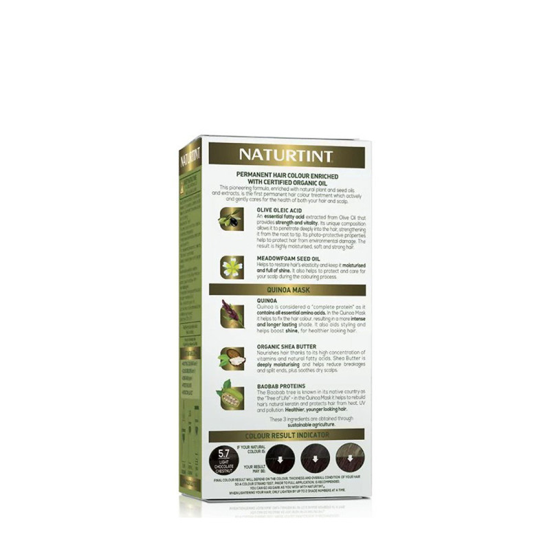 NATURTINT® 5.7 Colorant 60 ml: PEG-2 Oleamine. Aqua (Purified Water). Alcohol Denat. Peg-4 Rapeseedamide. Propanediol. Ethanolamine. Oleic Acid. Hydrolyzed Oat Protein. Hydrolyzed Corn Protein. Hydrolyzed Soy Protein. Hydrolyzed Wheat Protein. Limnanthes Alba Seed Oil. Tetrasodium Glutamate Diacetate. Sodium Metabisulfite. Sodium Erythorbate. P-Phenylenediamine. P-Aminophenol. 4-Chlororesorcinol. 2-Methylresorcinol. N,N-Bis (2-Hydroxyethyl)-P-Phenylenediamine Sulfate. 4-Amino-2-Hydroxytoluene. 2,4-Diaminophenoxyethanol Hcl. Octadecyl Di-T-Butyl-4-Hydroxyhydrocinnamate.