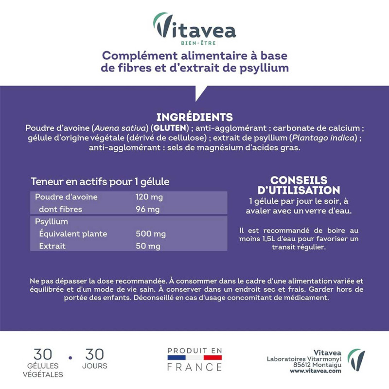 La formule Fibres Psyllium Vitavea Bien-être est votre alliée au quotidien en cas de lenteurs intestinales.