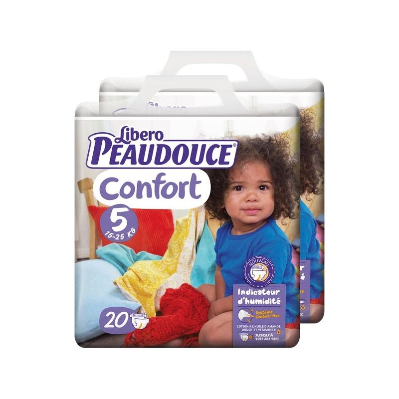 Couches bébé Libero Peaudouce confort offre la protection à nos bébés avec une lotion à l'huile d'amande douce et Vitamine E pour protéger la peau du bébé en textile respirable Jusqu’à 12h au sec. La protection de deux barrières anti-fuites et un indicateur d'humidité.Toutes les couches Libero Peaudouce font l'objet d'un contrôle de qualité rigoureux avec de deux cotés super flexibles et de système de fermeture mécanique.
