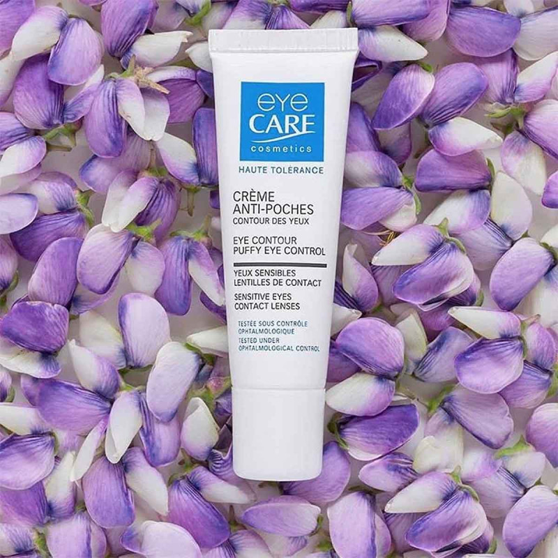 Eye Care anti-poche extrait de frêne, eau florale de bleuet, thé vert et gingko biloba. Leur pouvoir drainant diminue la surface et le volume des poches, redonne au regard un air plus jeune et reposé. ?