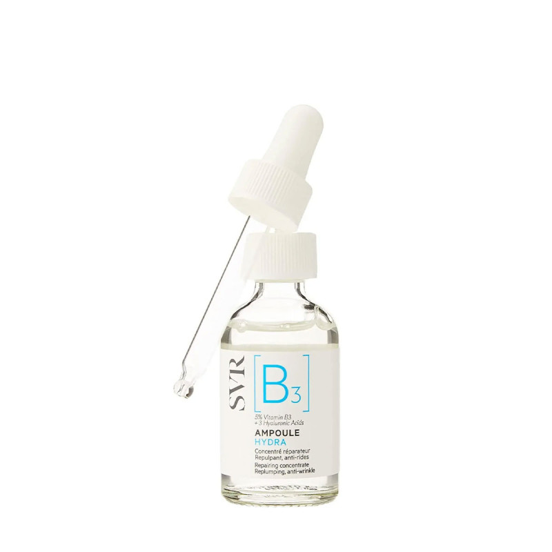 SVR [B3] Ampoule Hydra Concentré Réparateur 30 ml est un sérum ultraconcentré en vitamine B3 (5%) et de 3 Acides Hyaluroniques. Il apaise et renforce les peaux sensibles, déshydratées, inconfortables et les rides. Il recharge durablement ses réserves hydriques et les tiraillements sont réduits immédiatement. Jour après jour, les signes de l'âge sont estompés. Son efficacité est visible dès 7 jours.