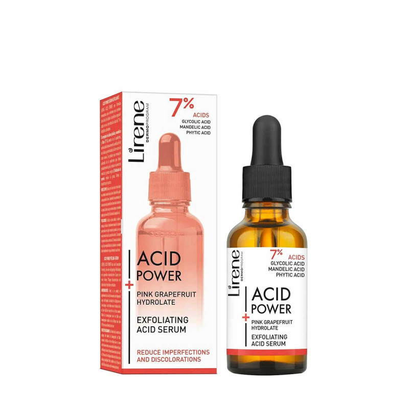 Sérum Exfoliant Acid Power pour les peaux hyperpigmentées et à tendance acnéique. Lirene Acid Power est une formule innovante contenant une combinaison unique d'acides professionnels à haute concentration - 7% et d'hydrolats apaisants. Un pH approprié minimise le risque d'irritation et de desquamation inesthétique de la peau, permettant une stimulation régulière et non agressive de la régénération cellulaire. Le soin lisse progressivement le grain et la tonicité de la peau, pour que le visage retrouve sa fraîcheur et son éclat de jeunesse.