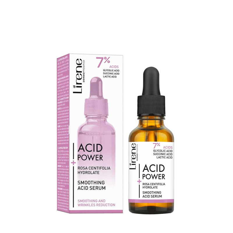 Lirene Acid Power Sérum lissant aux acides glycolique, succinique et lactique, idéal pour tous les types de peaux, y compris matures. La composition comprend des acides concentrés et puissants qui améliorent complètement l'état de la peau, ainsi que des hydrolats naturels qui ont un effet hydratant et antioxydant. La peau devient lisse au toucher, plus élastique et moins sujette à l'augmentation des rides