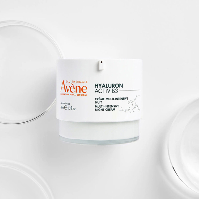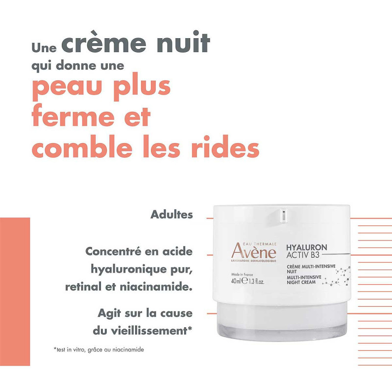 Avec l'âge tout s'accélère. Les cellules vieillissantes se propagent et la peau fonctionne au ralenti. Les laboratoires dermatologiques Avène créent la crème nuit Hyaluron Activ B3 contenant du rétinal, de l'acide hyaluronique pur, de l'extrait d'Haritaki et du niacinamide pour agir sur la cause du vieillissement et prolonger la vie des cellules. Dès le réveil, la peau est défroissée. Dès 15 jours, elle est réparée, plus ferme et les rides sont comblées. Véritable soin cocooning pour la nuit, sa texture délicatement parfumée apporte du confort à la peau, sans fini gras. Sa teinte légérement orangée est liée à la présence de rétinal.