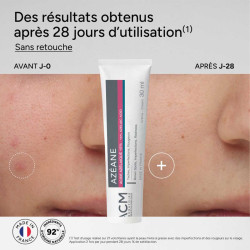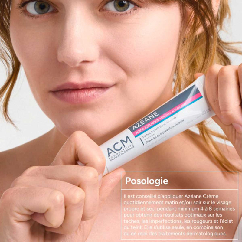 La crème à l’acide azélaïque Azéane est un soin multi-actions qui hydrate et améliore l’aspect général de la peau. Appliquée matin et/ou soir sur le visage, le décolleté et les mains, elle agit simultanément sur les imperfections cutanées, les taches, les rougeurs et le manque d’éclat, avec des résultats perçus dès 7 jours (1,2) !