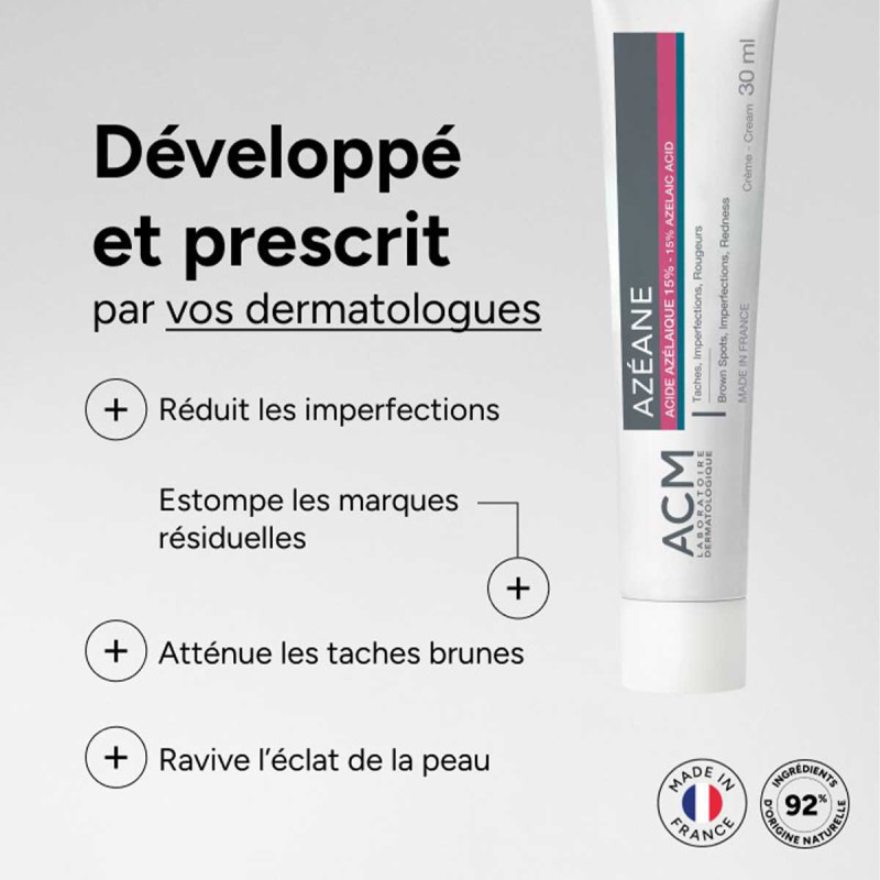 Formulé avec 92% d’ingrédients d’origine naturelle, Azéane contient 15% d’acide azélaique, un actif dermatologique reconnu pour ses propriétés antibactériennes, kératolytiques, anti-taches, apaisantes et anti-inflammatoires qui lui permettent de réduire les imperfections, estomper les marques résiduelles, atténuer les taches brunes, diminuer les rougeurs et raviver l’éclat de la peau.