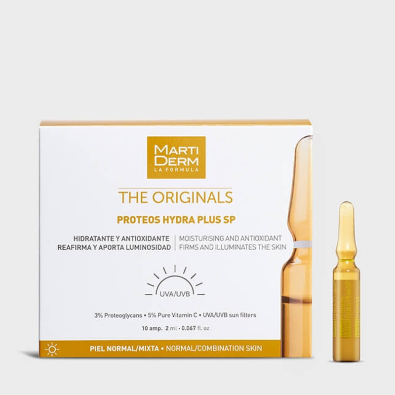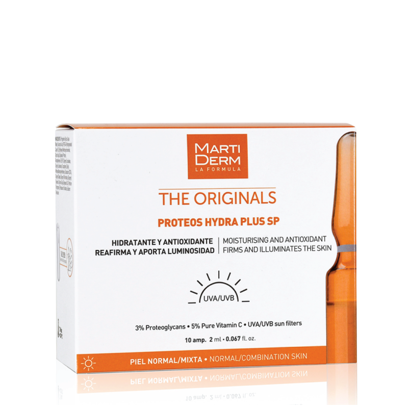 Formule hydratante et raffermissante à base de protéoglycanes et de vitamine C qui hydrate intensément, rend la peau lumineuse, possède un pouvoir antioxydant et aide à réduire les rides. Proteos Hydra Plus de MartiDerm se présente sous forme d'ampoule avec de la vitamine C.