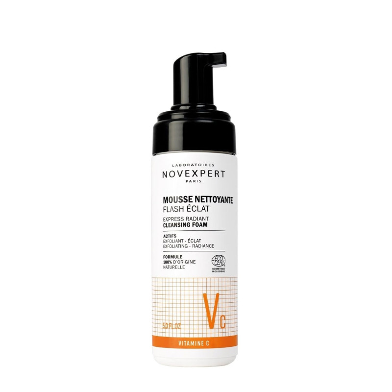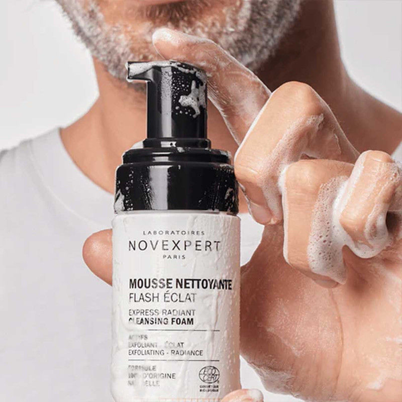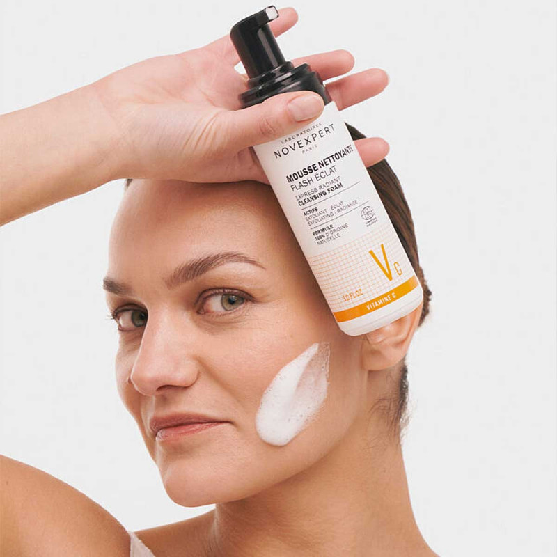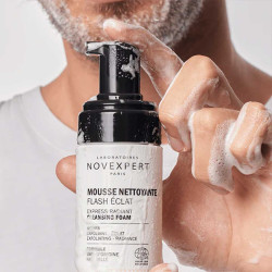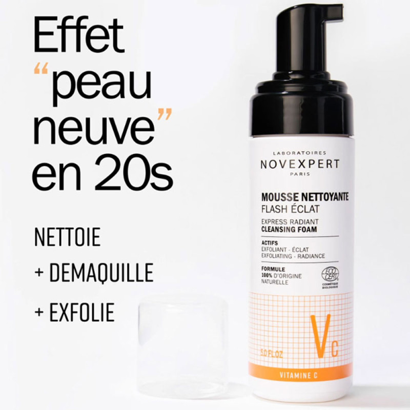 La Mousse Nettoyante Flash Éclat de Novexpert est formulée à 100 % d’ingrédients d’origine naturelle et riche en actifs dermatologiques. Sa texture aérienne offre un rituel express