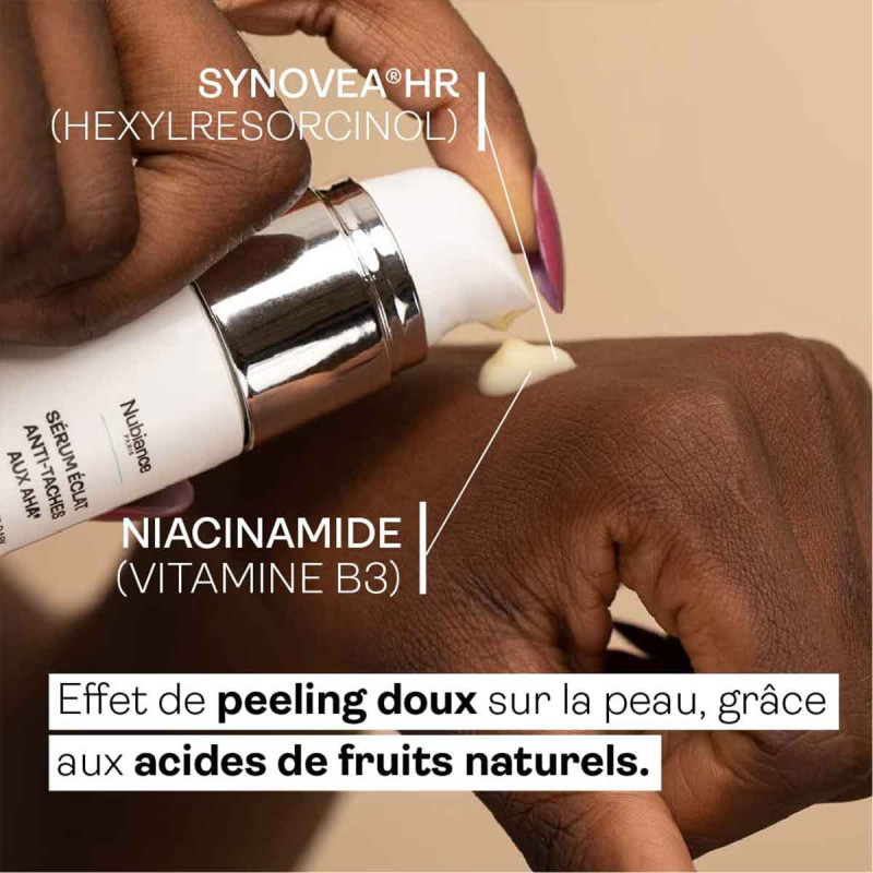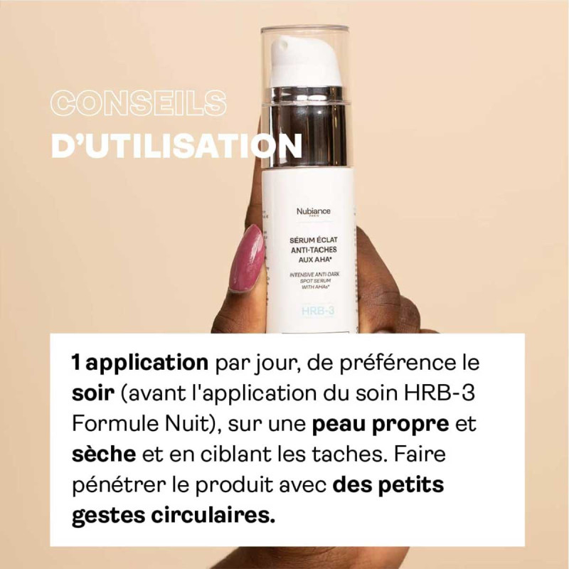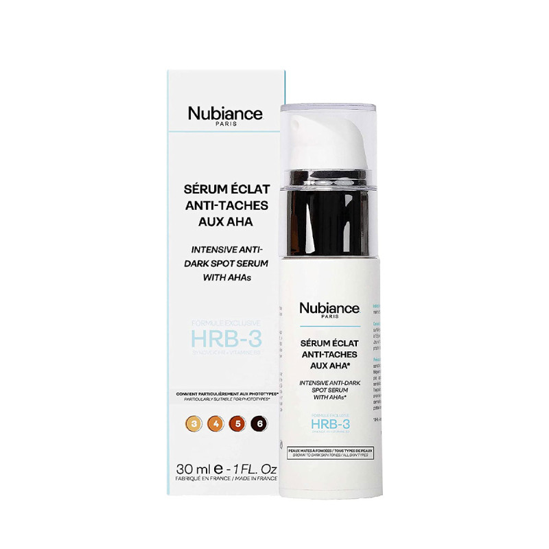 Le sérum éclat anti-tâches aux AHA du laboratoire Nubiance permet la régénération cellulaire accélérée grâce à une action peeling doux. I assure l' atténuation des tâches pigmentaires et des hyperpigmentations d'origines diverses