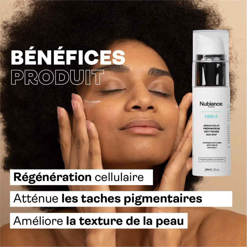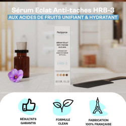 Retrouvez notre formule HRB-3 (Hexylrésorcinol + vitamine B3) dans ce Sérum Eclat Préparateur Anti-Taches ultra performant développé pour atténuer les hyperpigmentations d'origines diverses sur les peaux noires, mates et métissées.