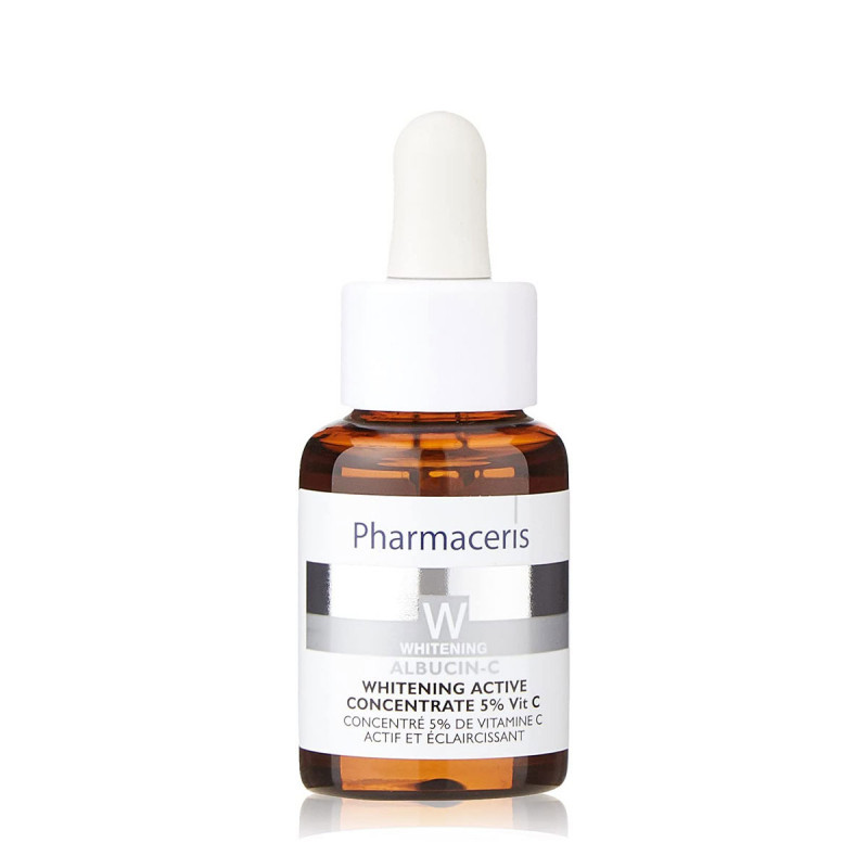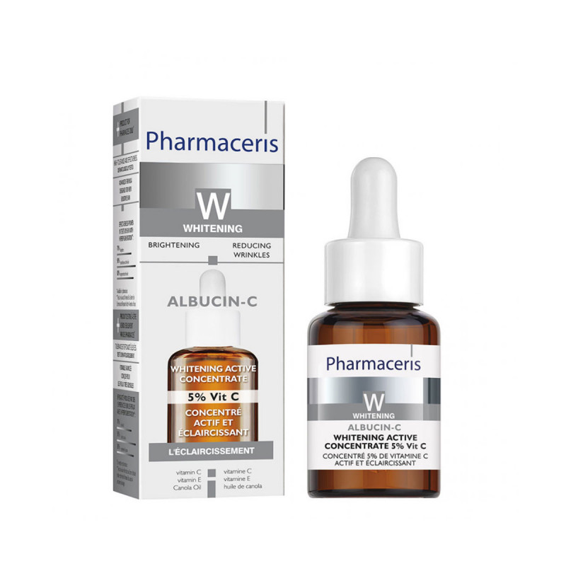 Pharmaceris Albucin Concentré actif éclaircissant 5% de vitamine, pour le soin quotidien des peaux matures, sèches et sensibles (visage, le cou, le décolleté, les bras) avec une hyperpigmentation, taches brunes ou teint inégal.
