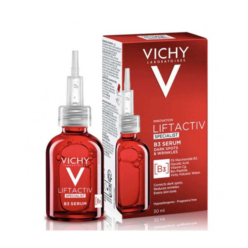 Vichy Liftactiv Serum B3 est un sérum anti-taches et anti-rides qui combat l’apparence et l’apparition des taches pigmentaires ainsi que les rides. Il contient un complexe anti-tache composé d’acide glycolique, de niacinamide et de vitamine Cg ainsi que des peptides pour combler les rides. Au fur et à mesure des applications, le teint s’unifie et retrouve de l’éclat, les traits sont lissés.