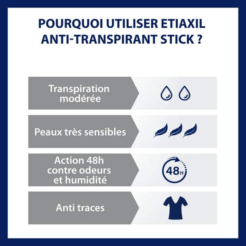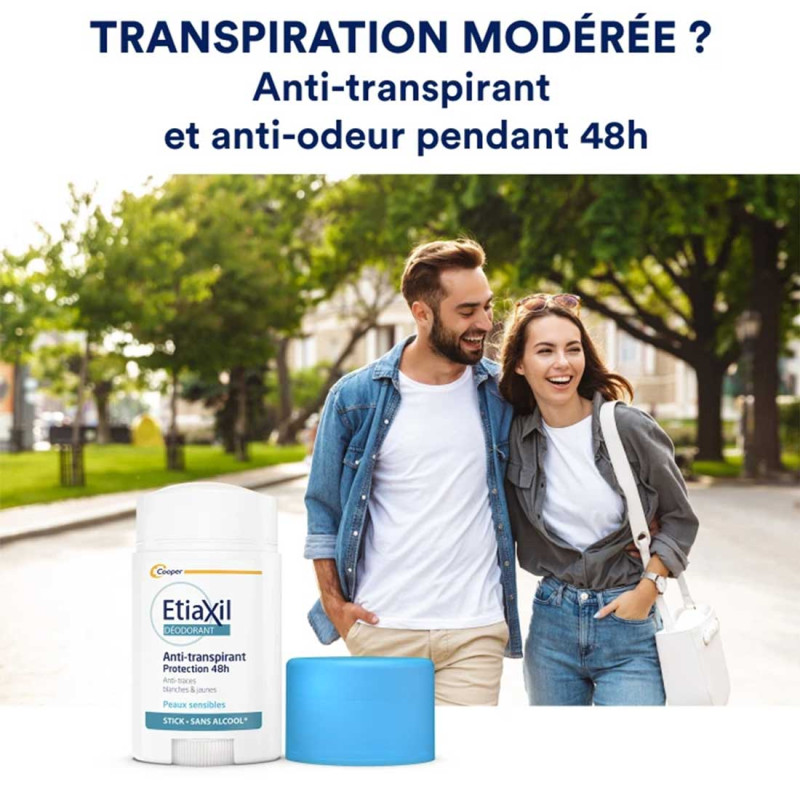 Le stick Etiaxil Anti-transpirant Protection 48h Aisselles est conçu pour un usage quotidien contre la transpiration modérée des aisselles.