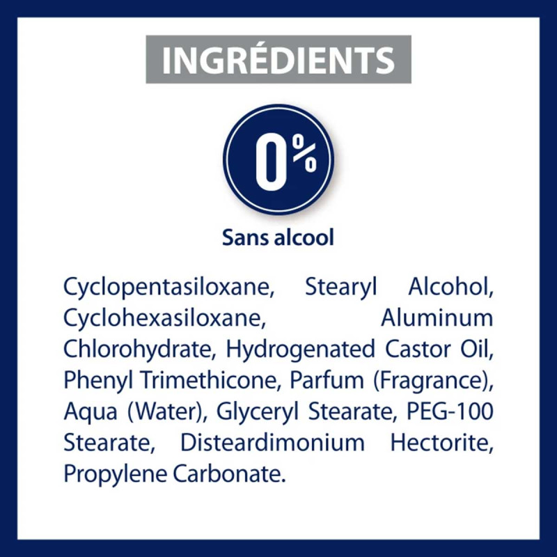 Son efficacité prouvée1 cliniquement stoppe la transpiration jusqu’à 48H et assure ainsi un contrôle total : anti-humidité, anti-odeur. Testé sous contrôle dermatologique, ce produit est formulé sans alcool et enrichi en agent apaisant pour maximiser le confort tous les types de peaux, même les plus sensibles, tout en apportant une sensation de fraîcheur tout au long de la journée. Sa formule haute tolérance est aussi anti-traces.