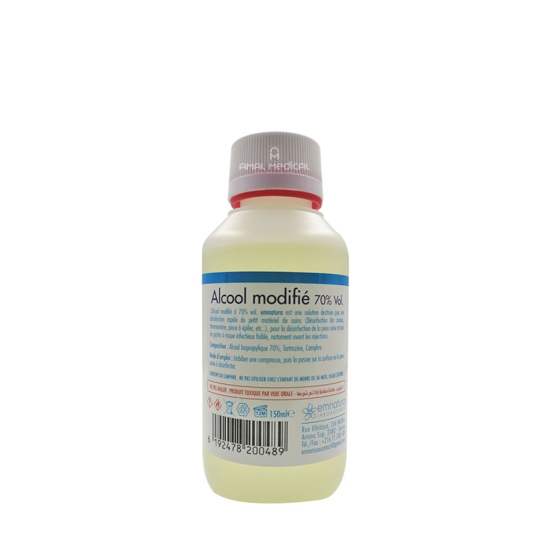 L'alcool modifié à 70% vol. Emnatura est une solution désinfectante pour une désinfection rapide du petit matériel de soins (désinfection des ciseaux, thermomètre, pince à épiler, etc,..), pour la désinfection de la peau saine et pour les gestes à risque infectieux faible, notamment avant les injections.