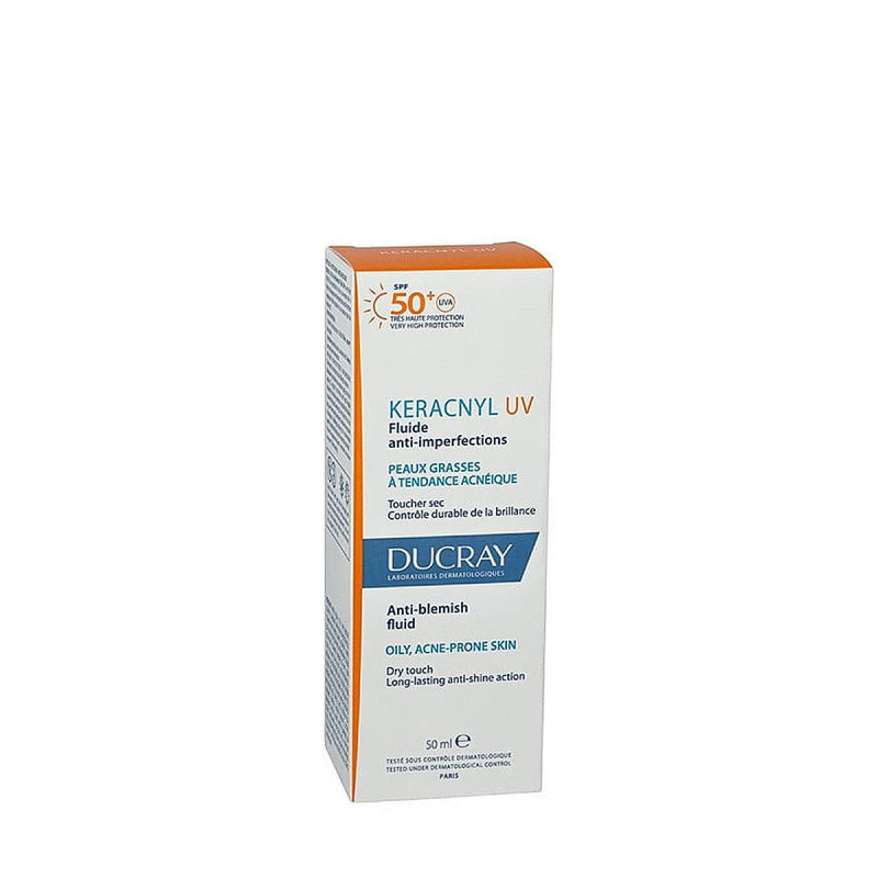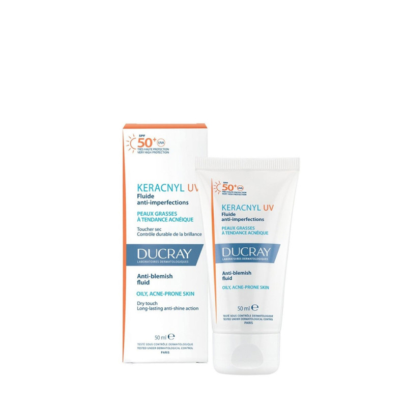Le SOIN SOLAIRE KERACNYL UV Fluide anti-imperfections protège la peau grâce à des filtres UVA/UVB brevetés offrant un SPF50+.