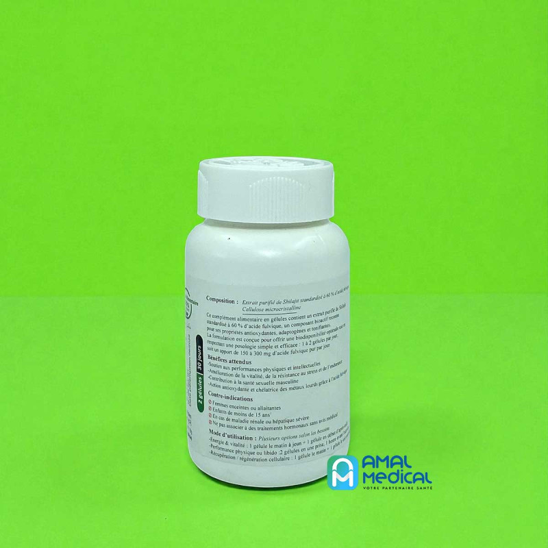 Le shilajit est un complément alimentaire en gélules contient un extrait purifié de shilajit standardisé à 60% d'acide fulvique, un composant bioactif reconnu reconnu pour ses propriétés antioxydantes, adaptogènes et tonifiantes. La formulation est conçue pour offrir une biodisponibilité optimale tout en respectant une posologie simple et efficace : 1 à 2 gélules /jour; soit un apport de 150 à 300 mg d'acide fulvique pur par jour.