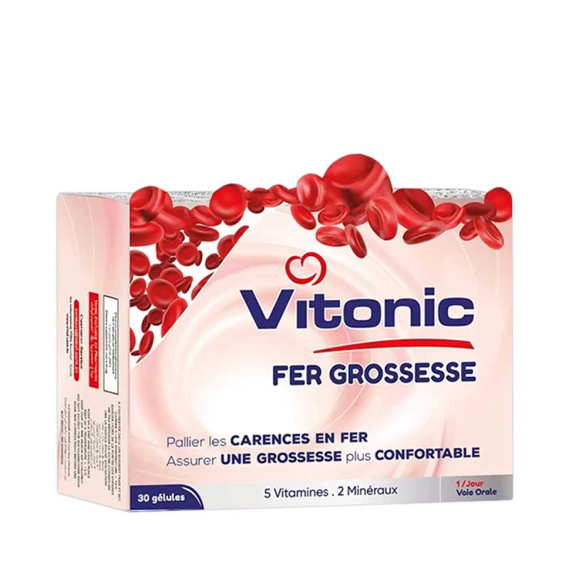 Fer Grossesse est un complexe des vitamines, des oligo-éléments et d'extrait de gingembre formulé spécialement pour aider la femme enceinte à pallier certaines carences, à assurer une grossesse plus confortable et à apporter de éléments nécessaires au développement de fœtus.