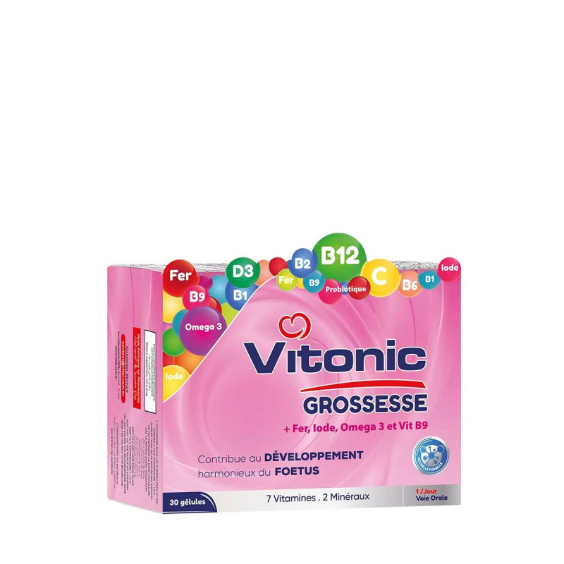 Durant la grossesse, les besoins nutritionnels de la femme augmentent considérablement. Ce complément alimentaire a été spécialement formulé pour répondre aux exigences de cette période si précieuse. Il contient une formule complète, enrichie en probiotiques, oméga 3, fer, iode, vitamine C ainsi qu’un complexe de vitamines du groupe B (B1, B2, B6, B9, B12) et vitamine D3.