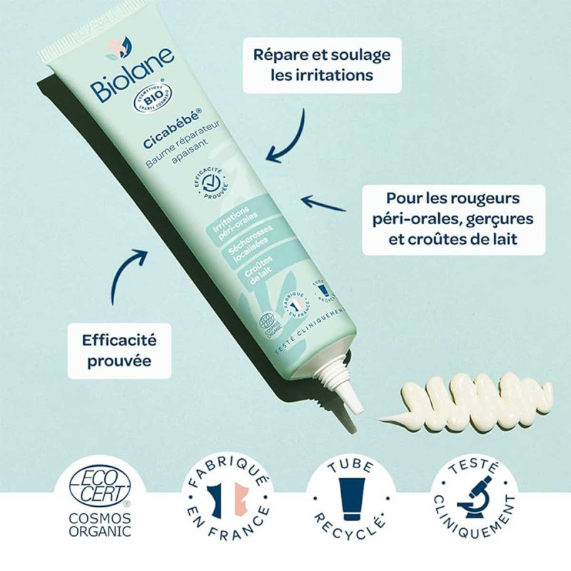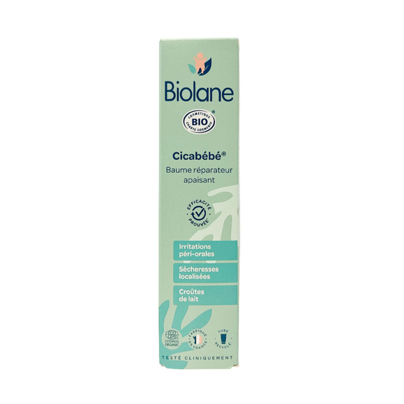 Certifié biologique, le baume réparateur et apaisant CicaBébé® Biolane, répare et soulage les sécheresses intenses et irritations superficielles du bébé (rougeurs péri-orales, rougeurs, croûtes de lait).