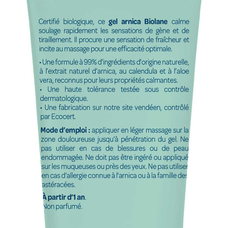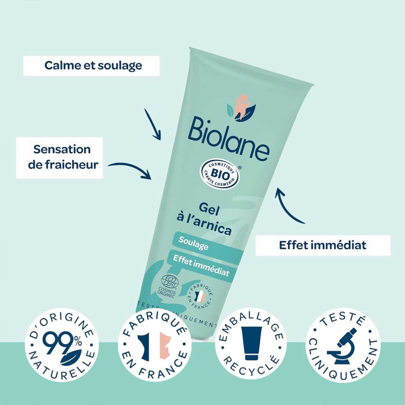 Certifié biologique, ce gel à l'arnica Biolane calme rapidement les sensations de gêne et de tiraillement. Il procure une sensation de fraîcheur et incite au massage pour une efficacité optimale.