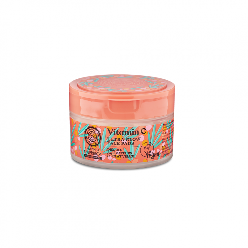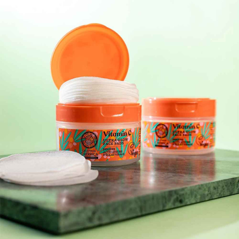 Les tampons végans et éclaircissants pour le visage apaisent parfaitement, nettoient en douceur et unifient le teint de la peau, lui redonnant son éclat radieux. Il contient de la vitamine C sous forme active (SAP), qui renforce les processus de défense de la peau et unifie sa couleur, et de l'hydrolat d'argousier de l'Altaï bio à effet hydratant et anti-âge. Les acides AHA uniformisent la structure de la peau, la rafraîchissent et l'éclaircissent