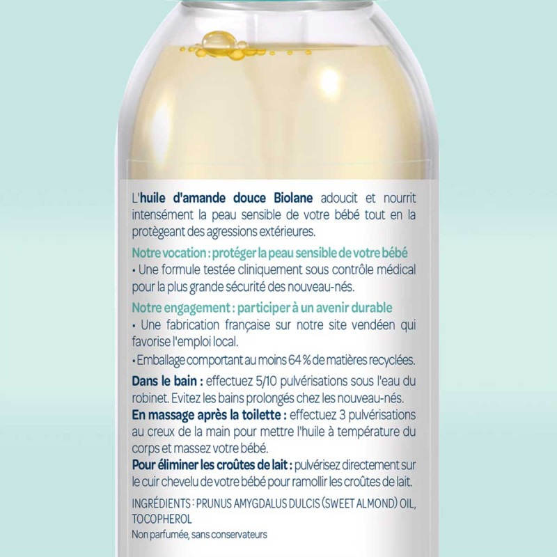 L’huile d’amande douce Biolane est un soin multi-usages naturel spécialement formulé pour répondre aux besoins des peaux sensibles et fragiles des tout-petits. Grâce à sa formule simple et pure, enrichie en huile d’amande douce 100 % naturelle, elle hydrate, nourrit et apaise la peau tout en la protégeant des agressions extérieures.