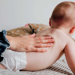 Pulvérisez 3 fois dans la paume, réchauffez entre les mains, puis massez délicatement le corps de bébé.