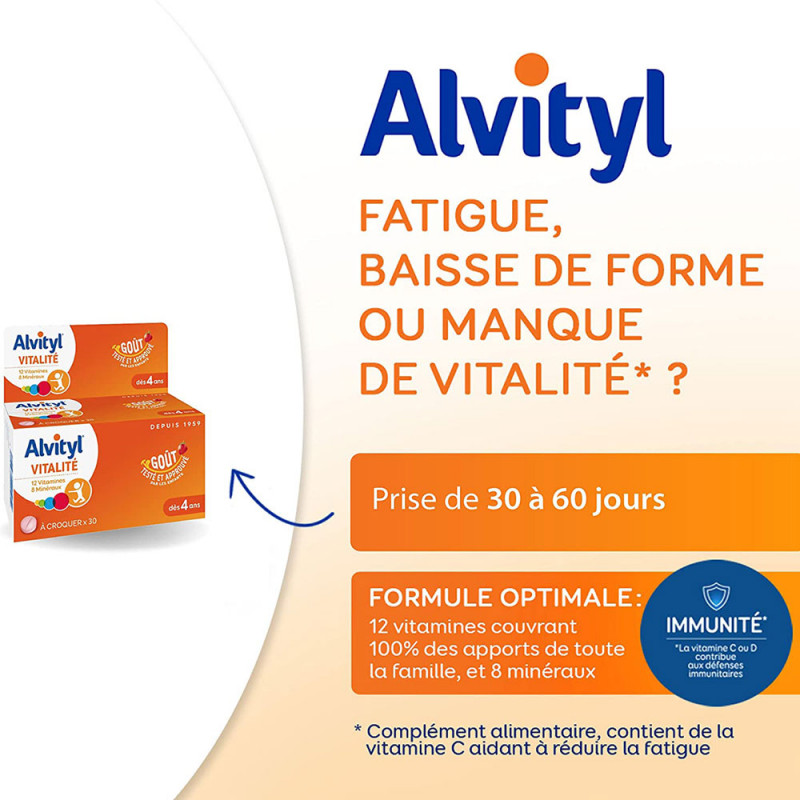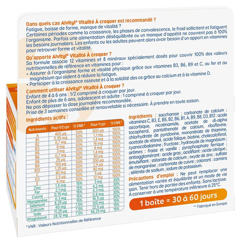Alvityl Vitalité à croquer est un concentré de vitalité dans un comprimé au délicieux goût de fraises, testé et approuvé par les enfants. Alvityl Vitalité à croquer contient 12 vitamines et 8 minéraux dans un format adapté pour couvrir les apports sur un mois complet dès 4 ans.