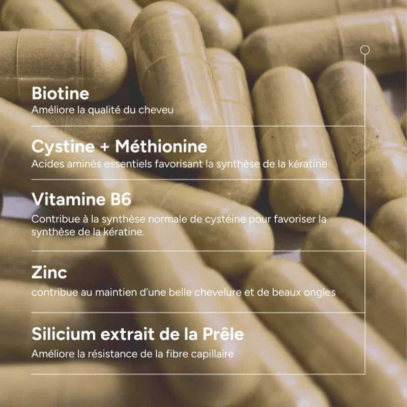 - La biotine et le zinc contribuent au maintien d'une belle chevelure. Le zinc contribue au maintien de beaux ongles. La vitamine b6 contribue à la synthèse normale de la cystéine. Le cuivre contribue à la pigmentation normale des cheveux.