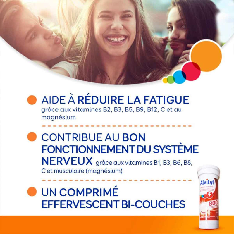 Alvityl® Boost : l’association unique de 12 vitamines et minéraux au Ginseng et la Caféine permet de booster l’énergie physique et mentale grâce à la vitamine B5 qui contribue à des performances intellectuelles normales et aide à réduire la fatigue. Le comprimé effervescent est spécialement conçu avec 2 couches distinctes pour une séparation des vitamines et des autres actifs. Adapté pour les adultes et les adolescents de plus de 15 ans, Alvityl® Boost, c’est le coup de boost nécessaire pour bien démarrer la journée.