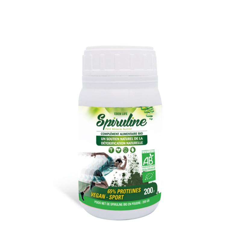 La spiruline est une variété de microalgues à très haute teneur en protéines et d'une richesse nutritionnelle exceptionnelle en acides aminés essentiels, vitamines et minéraux. Il aide à retrouver un bien-être général en apportant Tonus et Vitalité, il favorise la récupération physique et renforce le système immunitaire. La spiruline fournit de l'énergie et de la force, stimule le système immunitaire et augmente la protection antioxydante. C'est un « aliment sain » qui s'intègre dans une alimentation sportive, intellectuelle, diététique et nutritionnelle. La spiruline est particulièrement recommandée pour les sportifs, les femmes enceintes, les enfants et adolescents, les végétariens, les personnes fatiguées et stressées, les personnes obèses qui souhaitent perdre du poids, les personnes en convalescence et les personnes âgées. La Spiruline Eden Life est produite en Tunisie par un personnel technique hautement qualifié, dans le respect des règles d'hygiène les plus strictes et dans le respect des principes fondamentaux du développement durable.