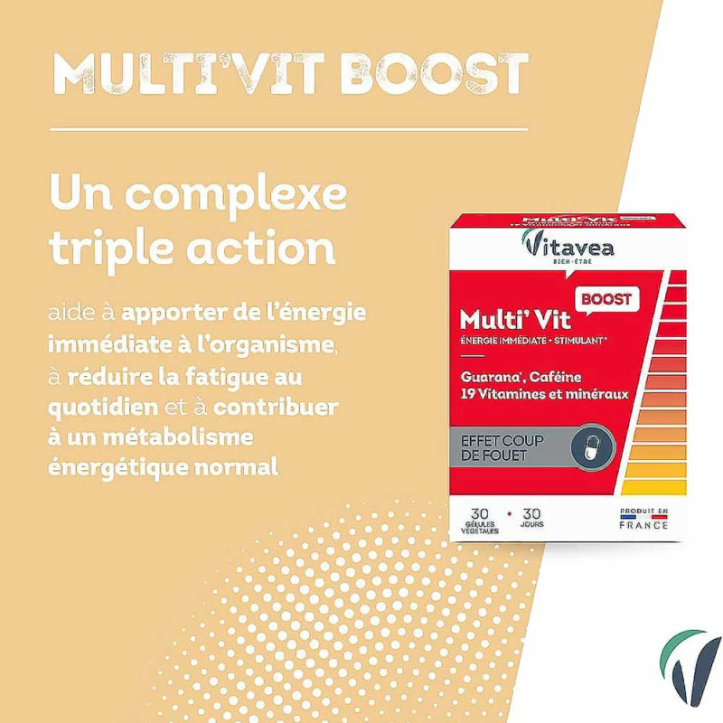 Multi'Vit Boost Vitavea Bien-être est un complément alimentaire qui contient des actifs reconnus et plébiscités pour booster l'organisme, renforcer le tonus et la vitalité et réduire la fatigue : vitamine C, magnésium, fer, guarana... Un cocktail de 12 vitamines et 7 minéraux.